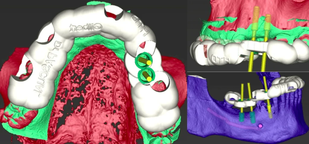 Grâce aux innovations technologiques, nous pouvons de nos jours, reproduire sur les patients, avec une très grande précision, le positionnement implantaire simulé avec le scanner 3D. Les avancées numériques permettent depuis peu de superposer les données osseuses du scanner avec l’image des dents et de la gencive grâce à l’empreinte optique numérique ou la numérisation des empreintes dentaires.